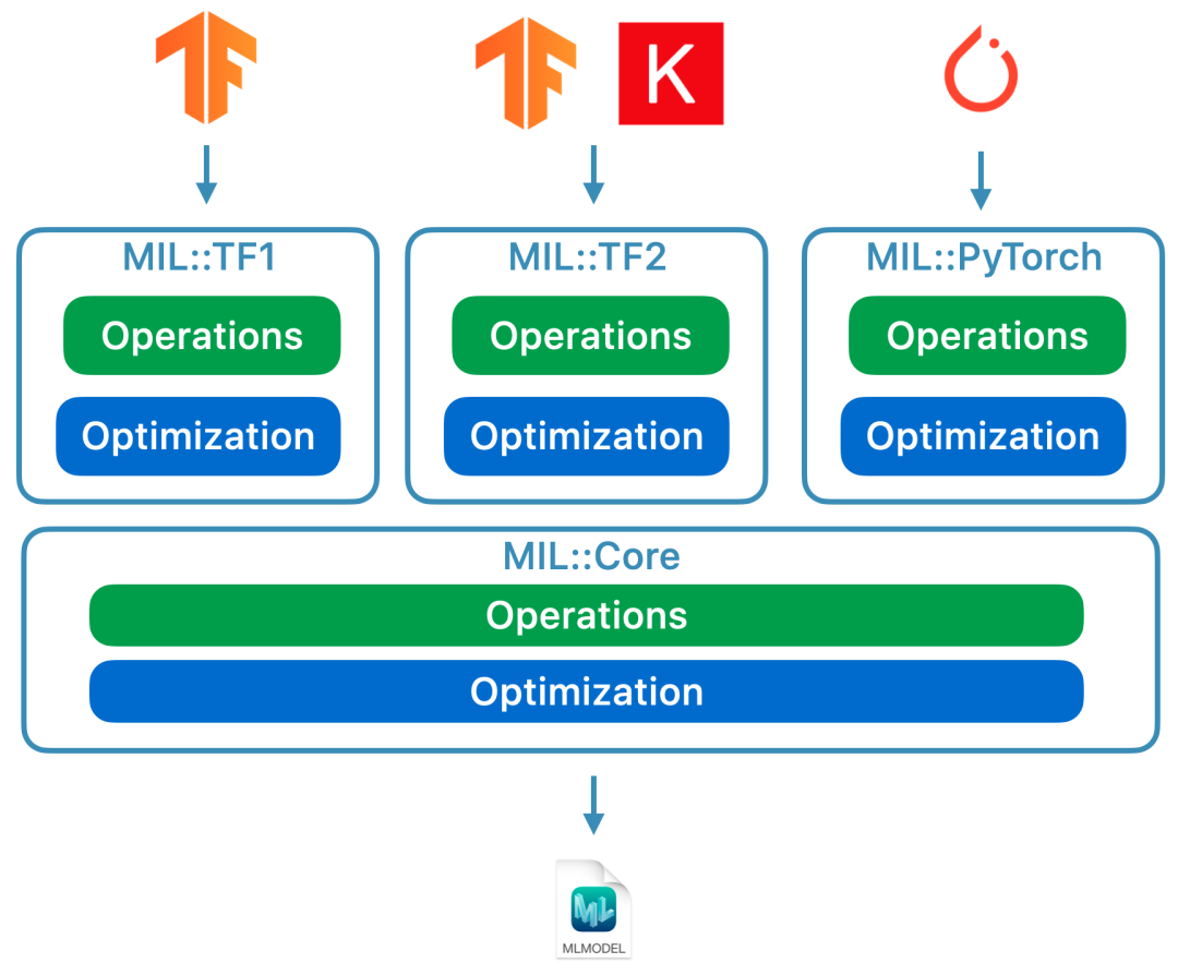 一旦模型转换为 MIL 格式,就可以根据一般规则进行优化了,比如剥离不必要的操作或将不同的层融合在一起。最后,将其从 MIL 转换为 mlmodel 格式。