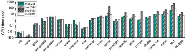 图 3. mcSVM、ovaSVM、ovoSVM 和 mcODM 在除 aloi 以外的所有数据集上的单一迭代时间成本。
