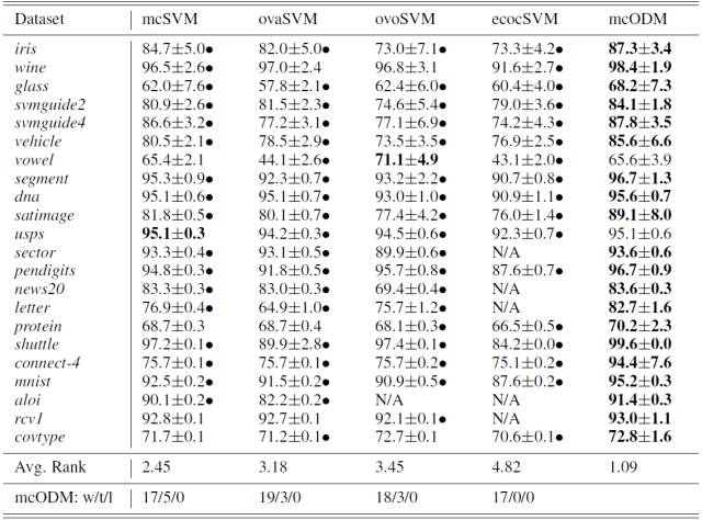 表 2. 22 个数据集上的准确率(meanstd.)对比结果。对比过程使用了线性核函数。每个数据集上的最优准确率加粗显示。黑点标记表示 mcODM 的性能极大地优于/差于与之对比的方法(成对 t 检验结果在 95% 的水平)。倒数第三行和倒数第二行是平均排序和 top1 次数。最后一行是 mcODM 的胜率/平率/负率(win/tie/loss)。ovoSVM 和 ecocSVM 未在 48 小时内在某些数据集上返回结果。