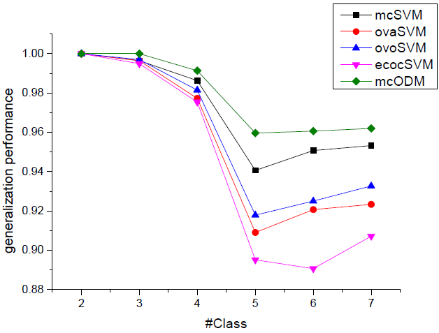 在本论文中,张腾与周志华提出了 mcODM(多类最优边界分配机),有效地解决了这个问题。为了优化,mcODM 被置于一系列凸二次规划(QP)中,研究人员也扩展了 Block Coordinate Descent(BCD)算法(Tseng,2001),以解决每个 QP 的双重问题。BCD 每次迭代的子问题也是一个 QP,通过特殊结构,研究人员导出了一种排序算法,它比通用 QP 算法更为高效。研究人员进一步提出了基于 Rademacher 复杂度泛化误差约束,并进一步提出了多类分类的泛化误差与边界分布关系的分析。在多达 22 各数据集的广泛验证中,mcODM 的表现超越了其他三种多类 SVM。