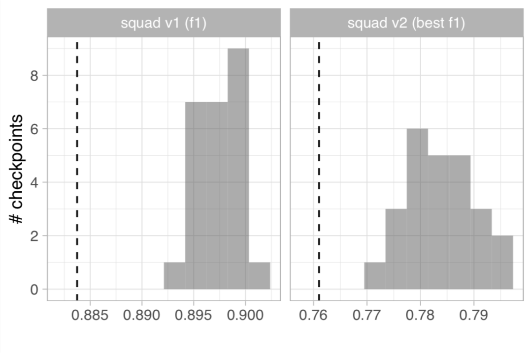 因为原版BERT没有提供随机种子,所以作者建议在这种模型下,同时汇报性能差异的95%置信区间。MultiBERTs比原版BERT在SQuAD2.0任务上的性能提升量的95%置信区间为提升1.9%~2.9%。