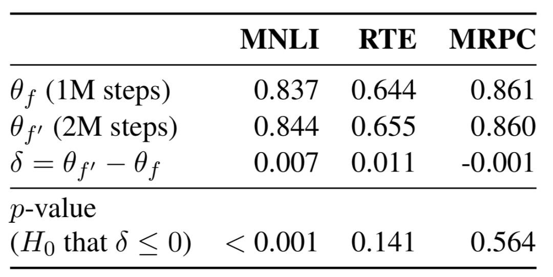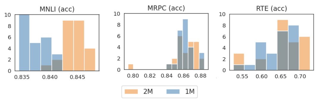 利用成对采样的策略可以进一步看出,虽然MNLI任务上,1M和2M迭代步数的预训练模型性能分布有较为明显的重叠。但两者具有较为明显的相关性,即在同一随机种子下,2M迭代的模型表现有很大概率高于1M迭代的模型。这导致了极高的显著性。
