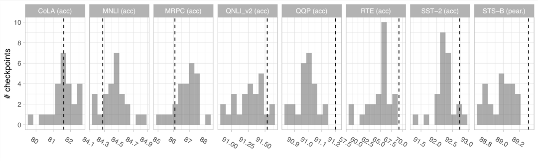 具体的,在GLUE及SQuAD下游任务上的表现如下图所示。每张图为25个格子,分别表示25个不同随机数种子下预训练的模型,在对应任务验证集上的表现。对每个预训练的随机数种子和每个下游任务的组合,均采用五次实验计算均值的方式汇报。虚线表示原始BERT汇报的结果。