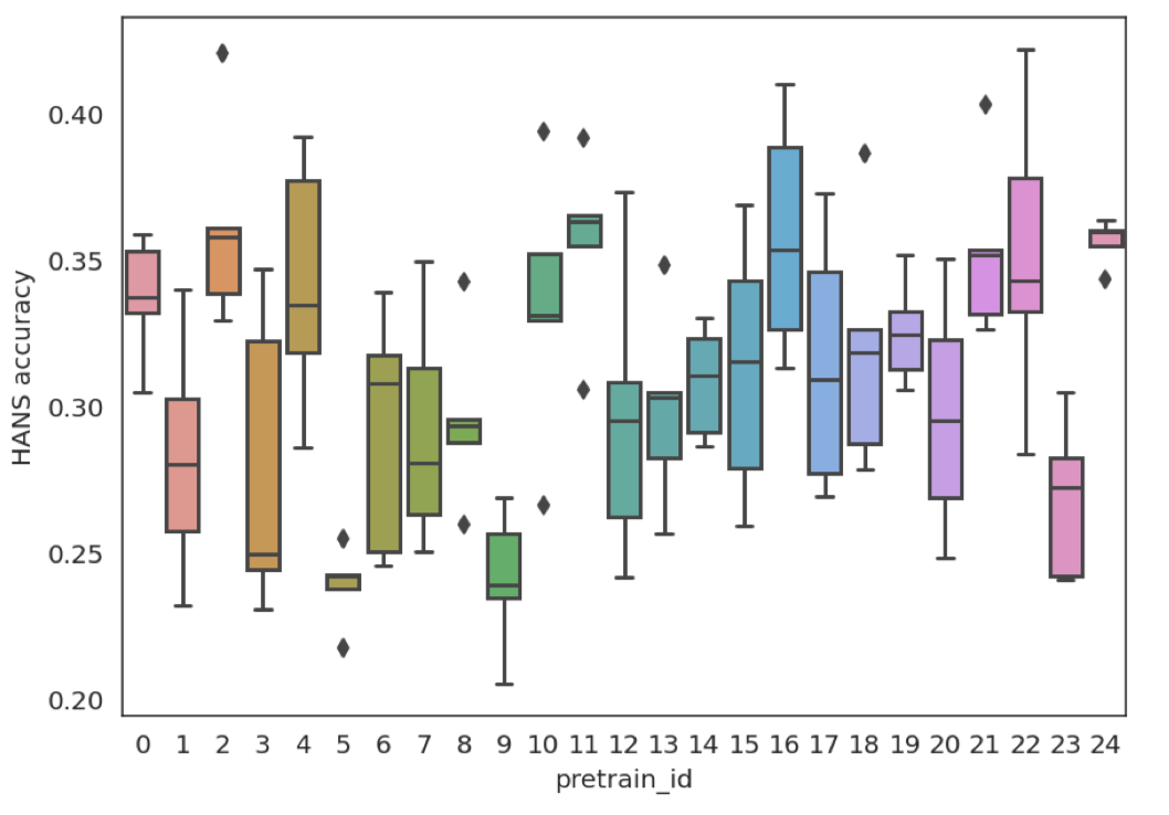 特别地,25个预训练随机数种子下,BERT模型在HANS(neg)[2]上的表现,如下图所示。可以看到,随着预训练中随机数种子的变化,模型在下游任务上的准确率可以有超过20%的波动。远大于同预训练种子的10%以内的准确率波动。因此,你的论文的实验结论可能仅在一个BERT的随机种子下成立。更换预训练种子之后,结论可能不再成立。我们也可以由此看到,利用不同随机数种子下BERT预训练的结果,对探究实验结论的鲁棒性十分必要。
