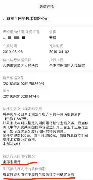 值得一提的是,在2019年4月2日,拉手网还被合肥市瑶海区人民法院判定为失信企业,因为其有履行能力却拒不履行生效法律文书确定义务。