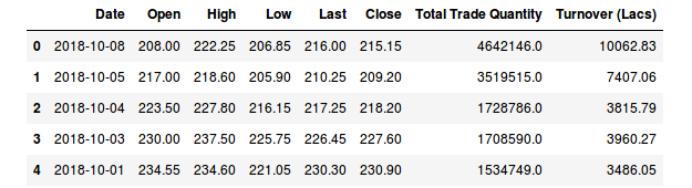 数据集中有多个变量——日期(date)、开盘价(open)、最高价(high)、最低价(low)、最后交易价(last)、收盘价(close)、总交易额(total_trade_quantity)和营业额(turnover)。