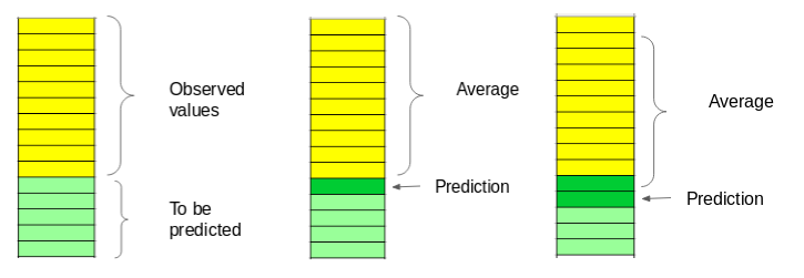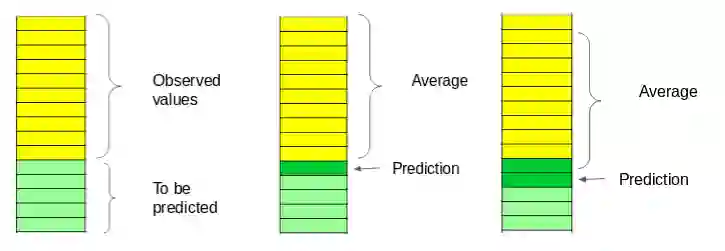 我们利用一组先前观测值的平均值作为每天的预期收盘价。我们将使用移动平均法,而不是使用简单的平均值,移动平均法使用最近的一组数据计算预测值。换句话说,对于后续的每个新的时间,在考虑预测值时,将从集合中删除最早的观测值,并加入上一个观测值。下面是一个简单的图,它将帮助您更清楚地理解这一点。
