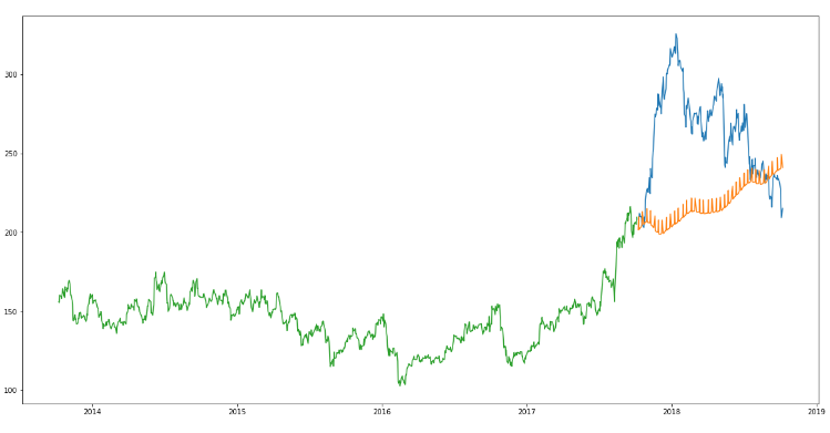 正如我们前面看到的,自动ARIMA模型使用过去的数据来理解时间序列中的模式。利用这些值,该模型捕捉到该系列中的增长趋势。虽然使用这种技术的预测比以前实现的机器学习模型的预测要好得多,但是这些预测仍然与实际值相距甚远。