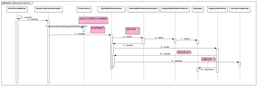 下面看“AOP 简单使用”这一节例子中调用 serviceBo.sayHello 时候的调用链路时序图从而加深理解: