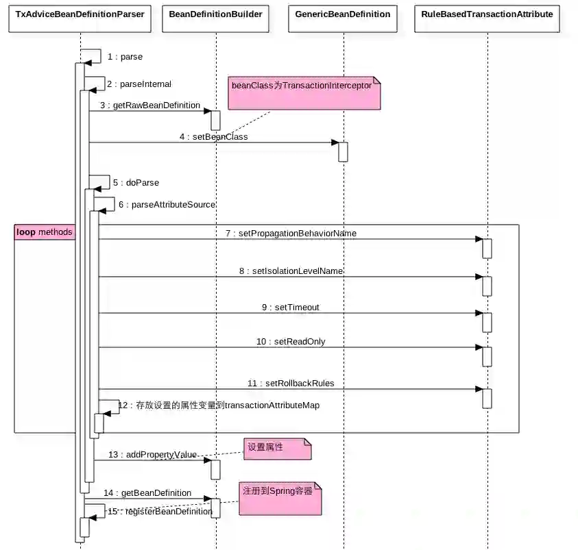 步骤(12)把所有的 method 标签的 RuleBasedTransactionAttribute 对象存在到了一个 map 数据结构,步骤(13)设置解析的所有属性到建造者模式的对象里面,步骤(14)使用建造者对象创建一个 bean 定义,步骤(15)则注册该 bean 到 Spring 容器。