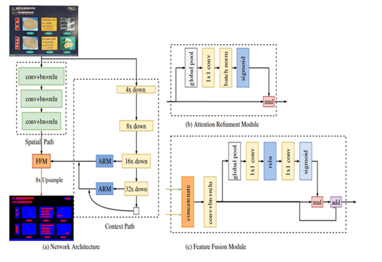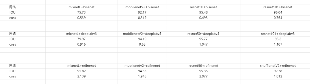 从基础网络上看,shufflenet 速度更快,resnet 效果更好。网络结构上从性能上分析 bisenet 性价比更好。我们在项目中使用的是 Bisenet 框架,在学习特征时并行两条支路,一条学习空间细节信息,一条支路学习高层语义信息,然后将学到的信息融合,能够更好学习到全局信息和局部信息特征信息。