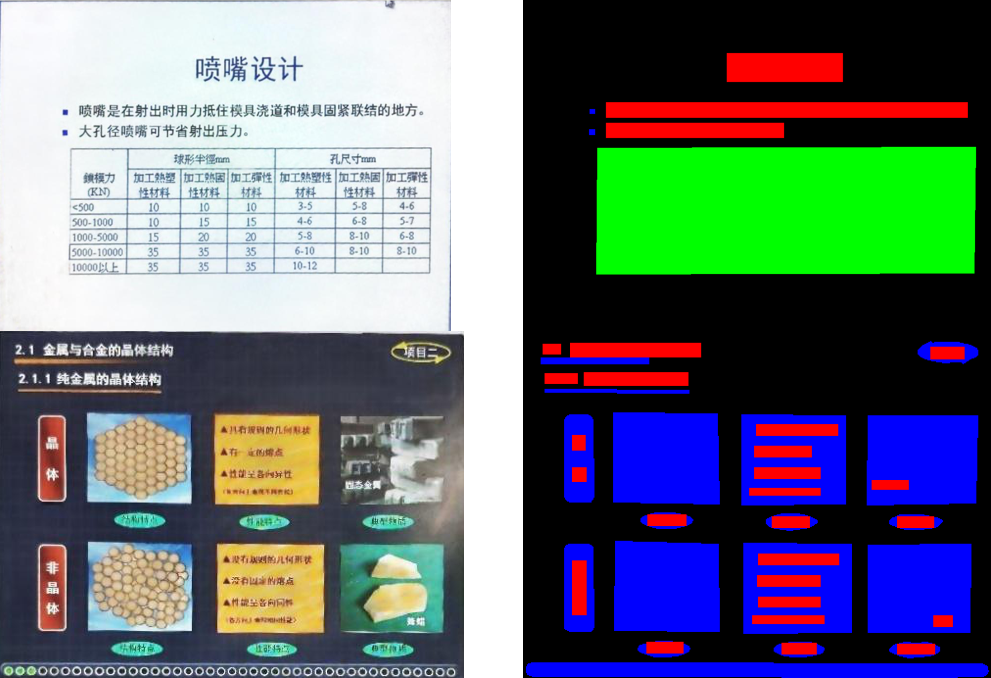 通过以上步骤,我们可以获取到比较干净工整的 PPT 内容图片,这一步我们要通过语义分割,检测到图片的实体部分,方面后续生成 PPT。本模块在图片转 word 和图片转 excel 中都需要的模块。对于 PPT 图片,我们主要分割的类别为文本,图片,表格,背景。下图为标注的语义分割类别示意图。