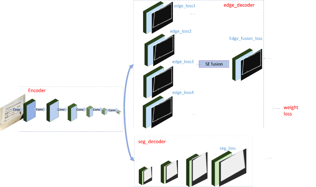 通过 case 分析,我们预测的选框通常会多出背景区域,如果通过语义分析知道大致的文档内容区域,再通过边缘线条检测准确的边框信息,融合信息是否能得到更精确的选框。所以在原有基础上增加了一个分割分支,多任务学习,在 decoder 模块分出两个分支,一个分支学习图像的边缘信息,一个分支学习图像的语义信息,如下图所示。