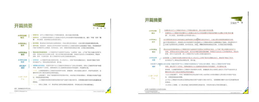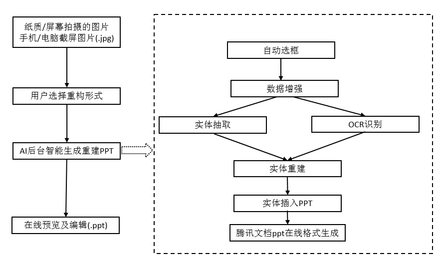 目前越来越多的资源信息是以图像形式存储,然而很多用户在获取图像后需要对图片进行编辑或者电子文档形式进行存储。最主流的做法是直接进行 OCR 提取,但这种方法无法满足用户对排版的需求。当前主流办公产品比如 office,wps,腾讯文档等会采用一些技术对图片进行排版恢复还原为 doc 形式的文档,通常针对以文字偏多,格式简单的图像效果比较好,但如果内容丰富,图片并茂的 ppt 内容图像在转为 doc 文档时由于图像比例,文档排版插入限制以及文档适应背景单一而丰富背景还原度差等问题会导致很多 ppt 形式的图片无法很好还原为电子文档。