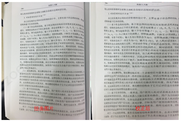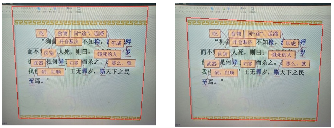 OCR 也是我们重建的一个重要模块,除了能够提取图片中的文字信息,还有一个作用是可以通过文本检测框获取到图片中文本的旋转角度。但是目前 OCR 对于角度的预测在-45---45 角度之间比较准确,对于 90 度,180 度的旋转图片,预判角度不太准确。我们采用的方案是首先通过小的分类模型预测图片的象限方向,分类类别为[0,90,180,270]。先把图片旋转到-45~45 之间。再通过 OCR 预测角度讲图片旋转到 0 度。效果如下图: