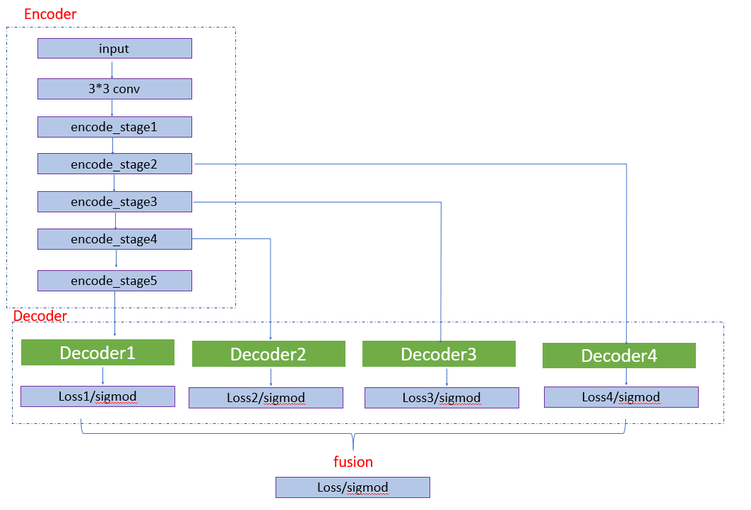 对内容的框选现有很多技术,比如图像处理的边缘提取,但是效果不好需要特别多的后处理,随着 AI 的发展,也有一些深度学习的方法对边缘进行提取,比如 HED 网络。前期同事也基于 hed 进行了模型训练得到了不错的检测效果。使用的框架图如下图: