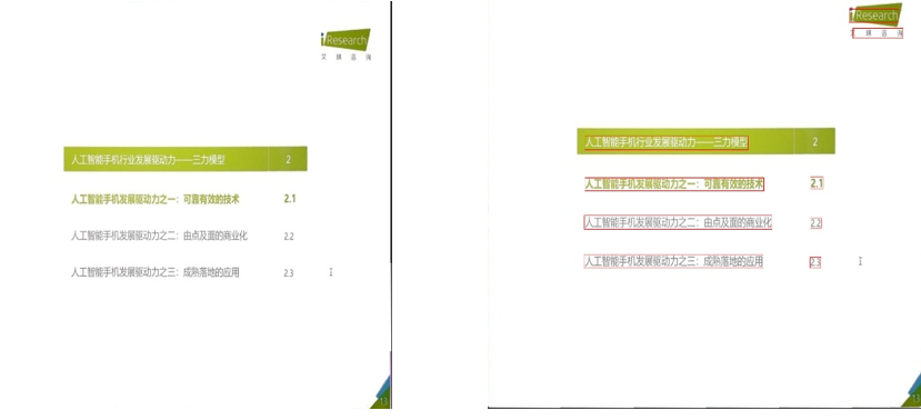 通过实体分割文本段以及 OCR 提取后,可以获取到文本框信息。如图 17,左图为原图,右图红框为我们获取到的文本区域,但是无法直接获取到字体颜色。