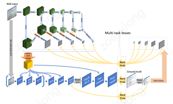 对于屏幕拍摄图片,摩尔纹很影响我们后续处理的图像质量,所以检测到图片后我们首先通过小的分类模型判断是否需要对摩尔纹进行处理,如果属于屏幕拍摄场景会调用去摩尔纹模块。去除摩尔纹的网络框架和效果图如下:
