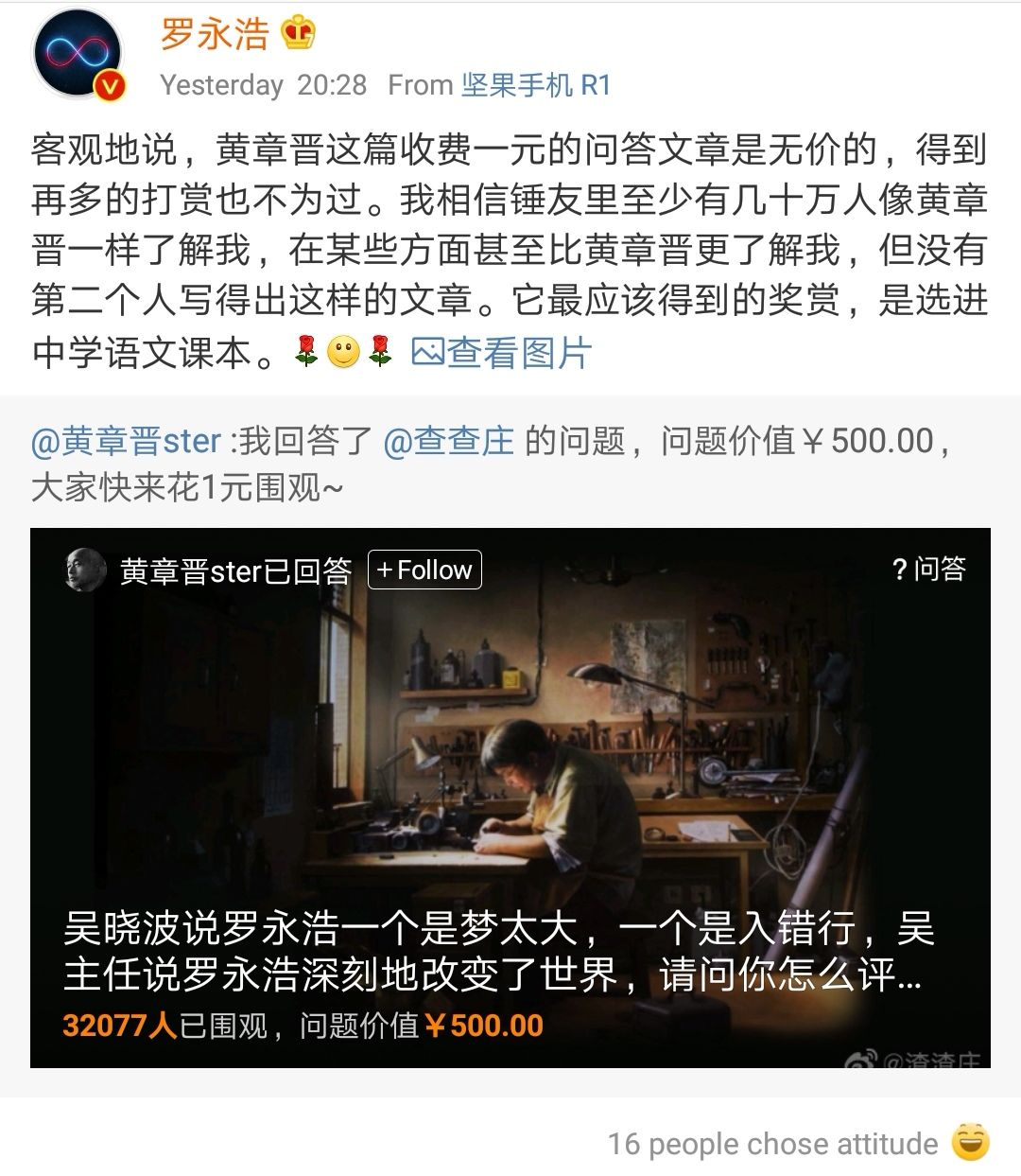 5月6日晚间,锤子科技CEO罗永浩在回应媒体人黄章晋一篇付费回答时称: