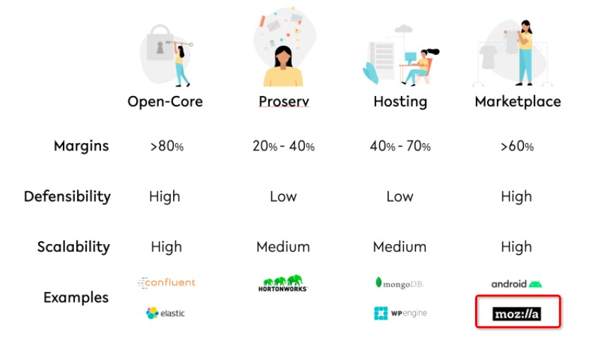 Mozilla 的商业模型也是这个,每年约 5 亿美元的收入中有很大一部分来自为搜索引擎引流。虽然这是一种相对少见的模式,但是现在越来越多的开源初创公司在探索这种“市场”模式。