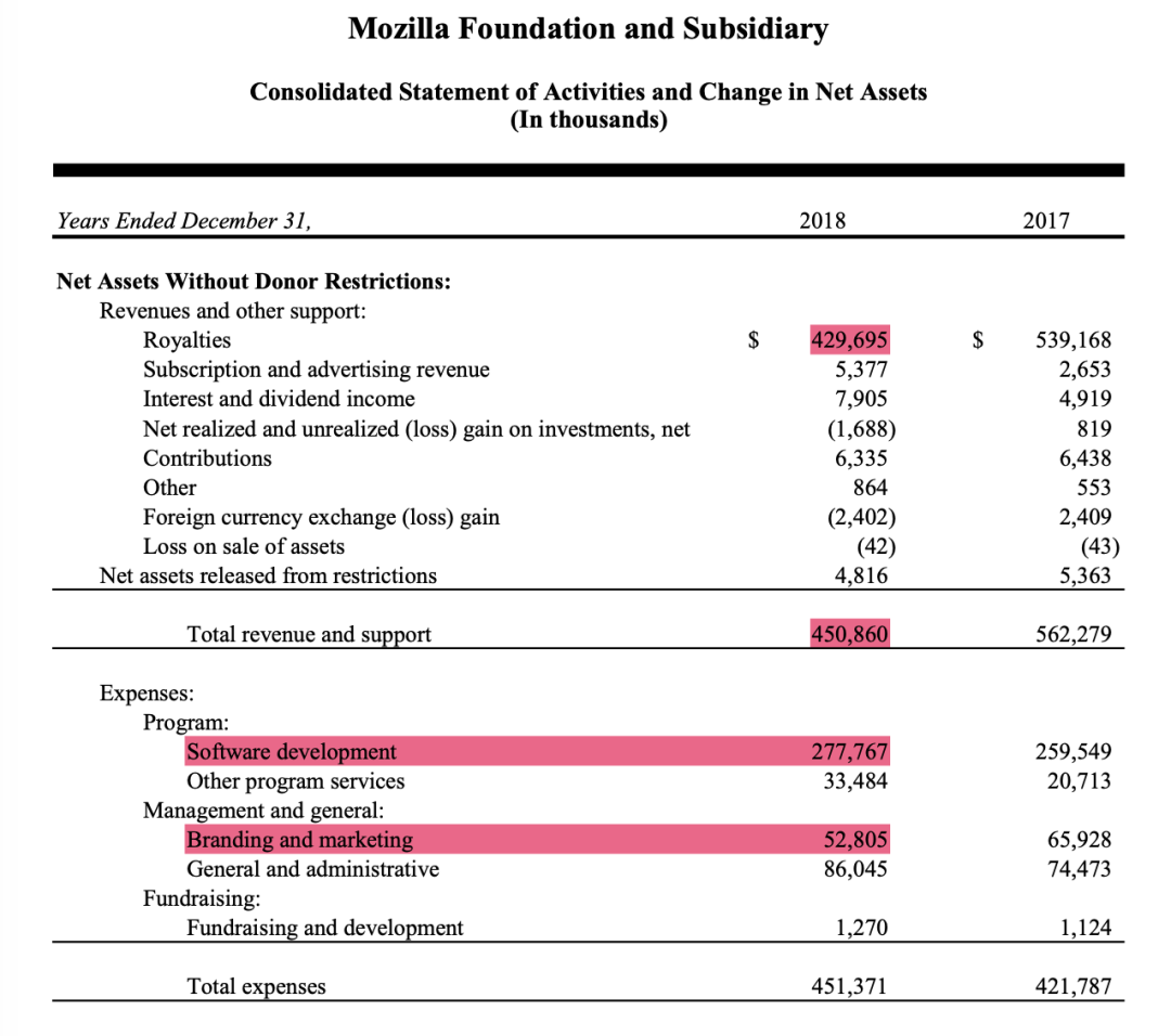 从这两年的财报可以看出,Mozilla 的收入严重依赖授权,2017 年和 2018 年的授权收入占比达到了 93% 和 91%,单一收入来源会带来很大的风险。更令人揪心的是,Mozilla 与搜索引擎厂商的合同将在 2020 年 11 月到期(来源:2018 年财报 P25)。