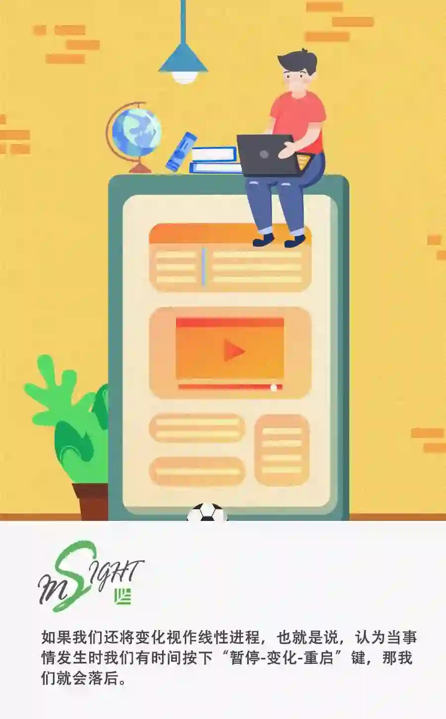 与过去完全不同,如今大多数的数据采集和决策都在网络中发生,信息以光速传播。如果我们还将变化视作线性进程,也就是说,认为当事情发生时我们有时间按下“暂停-变化-重启”键,那我们就会落后。