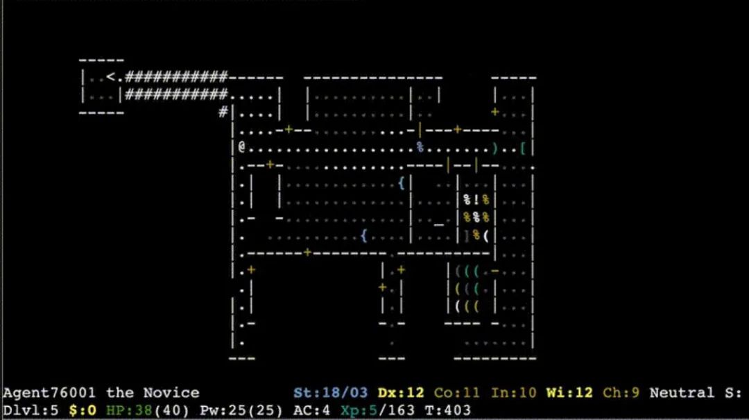 2021 年底,Facebook 团队(现在是 Meta)发起了一场名为「NetHack 挑战」的大型比赛,这一事件给我们敲响了警钟。《NetHack》是早前游戏《Rogue》的延伸,也是《塞尔达传说》的前身,是一款发行于 1987 年的单人地下城探索游戏。游戏图像在原始版本中是纯 ASCII 字符,不需要 3D 感知。与《塞尔达传说 旷野之息》不同,这款游戏没有复杂的物理机制需要理解。玩家选择一个角色(如骑士、巫师或考古学家),然后去探索地牢,收集物品并杀死怪物以寻找 Yendor 护身符。2020 年提出的挑战是让 AI 玩好游戏。