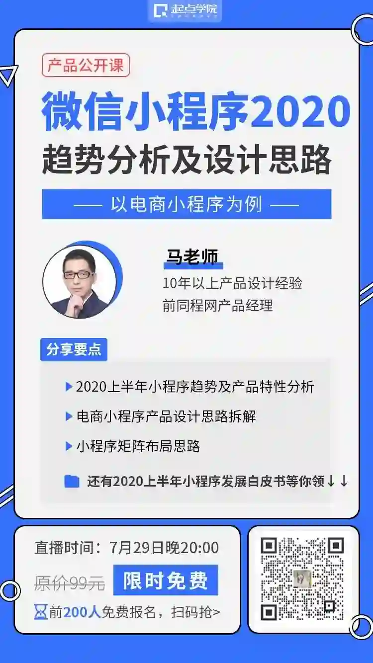 为了帮助意向进入小程序领域的产品同学,更快上手小程序产品设计,起点学院特邀业内资深产品老司机@马老师,以电商小程序为例,带你拆解——