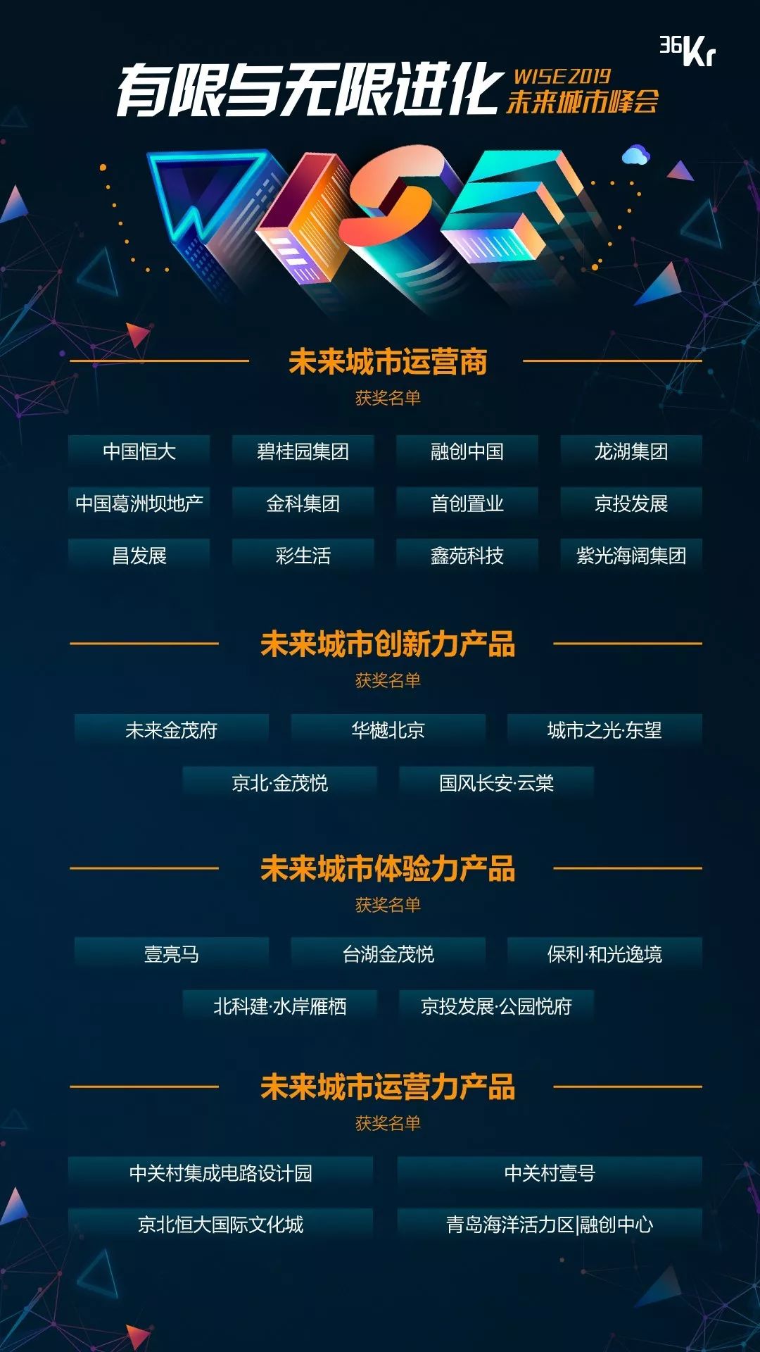 36氪未来城市峰会向新经济下勇于进化的创新者致敬,并评选表彰足以影响未来城市发展的城市运营商、体验力产品以及运营力产品,正是因为他们的不懈努力,我们的城市、生活才得以真正走向进化。