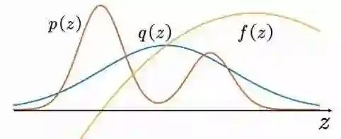 如图4.6所示,当随机变量z的分布非常复杂时,无法利用解析的方法产生用于逼近期望的样本,这时,我们可以选用一个概率分布很简单,很容易产生样本的概率分布,比如正态分布。原来的期望可变为