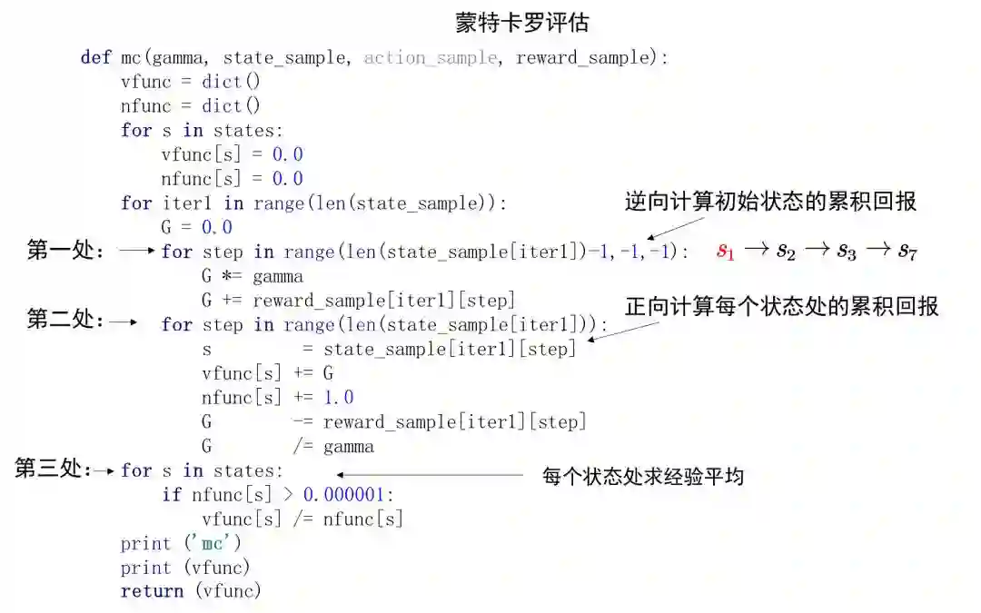 第一处:对于每个模拟序列逆向计算该序列的初始状态处的累积回报,也就是说从序列的最后一个状态开始往前依次计算,最终得到初始状态处的累积回报为,计算公式为