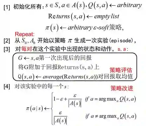 第一,第2步中,每次试验的初始状态和动作都是随机的,以保证每个状态行为对都有机会作为初始状态。在评估状态行为值函数时,需要对每次试验中所有的状态行为对进行估计;