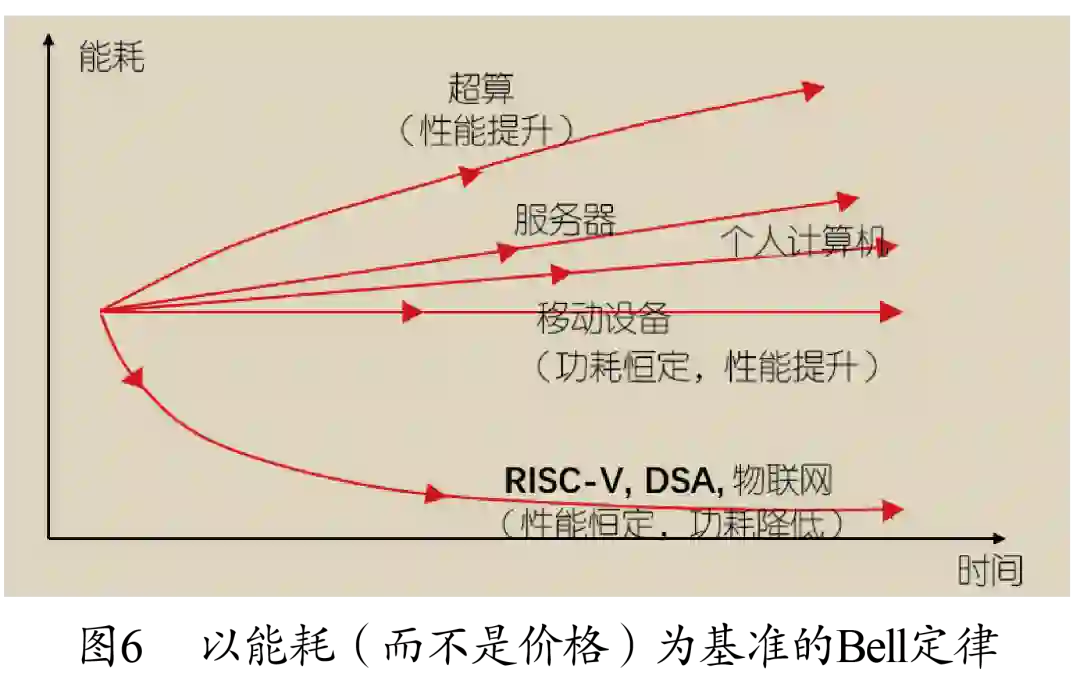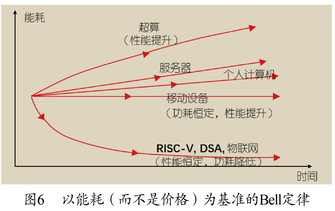 能效现在已经成为更为重要且紧急的指标。麻省理工学院管理学院教授艾瑞克·布林约尔松(Erik Brynjolfsson)指出,库梅定律的重要性要超过摩尔定律。如果我们把贝尔定律的Y轴改为能耗,那么既成“阶级”则是ARM,因为它的能耗基本维持在一个常量。在其上的“阶级”是超算和个人电脑的CPU,而在其下的是RISC-V和其他架构,算能比超过ARM,当然也要更优于x86(见图6)。