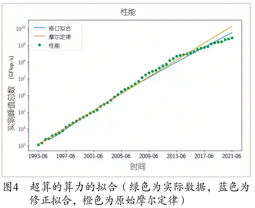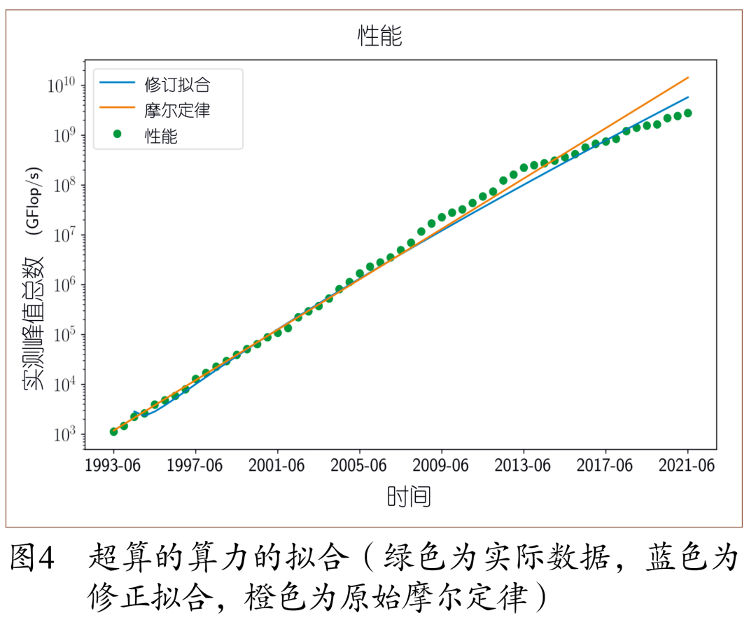超算的排行榜Top500的总算力之和,也与摩尔定律偏离得越来越远。尼克定律可以更好地拟合这些数据(见图4)。
