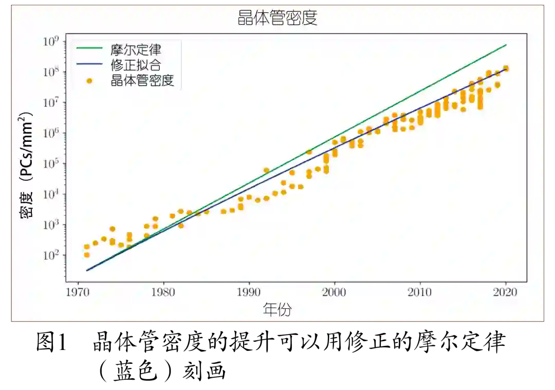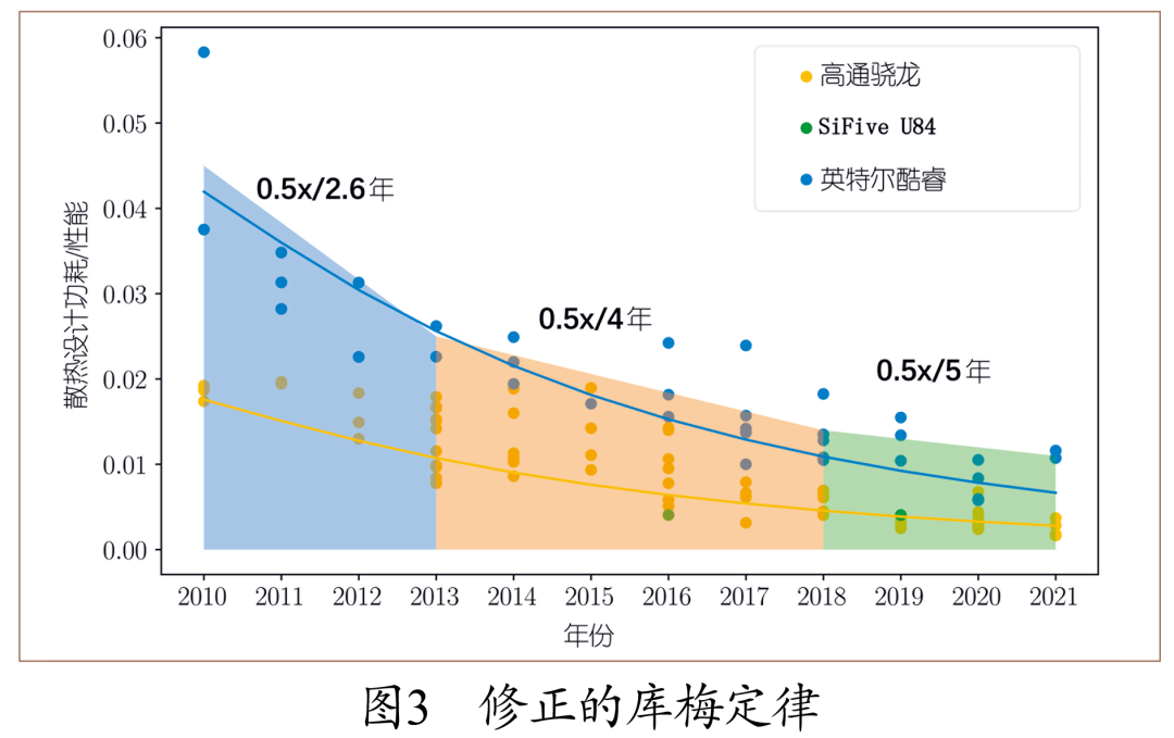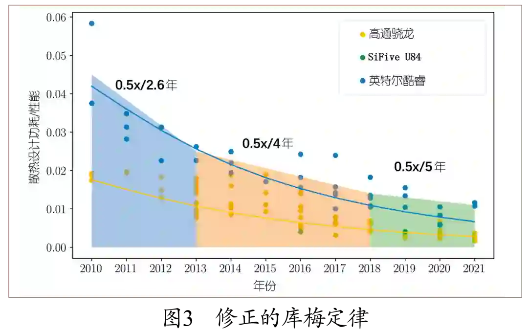 芯片性能的提升主要涉及半导体工艺和体系结构的改进。性能提升的同时,能耗也在提升。随着摩尔定律越来越偏离最早的预测,与摩尔定律相关的各种衍生定律,例如库梅定律(Koomey’s Law)[7]等也都和原来的预测结果偏离越来越大。事实上,性能的提升不是一个固定的比例,而是一个变量。本文提出摩尔定律的一个定量修正,旨在更准确地预测芯片发展的未来趋势。