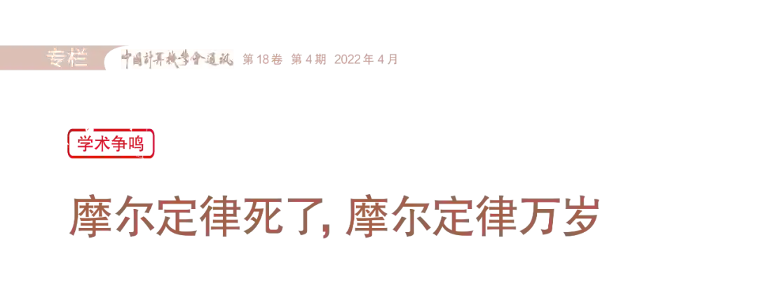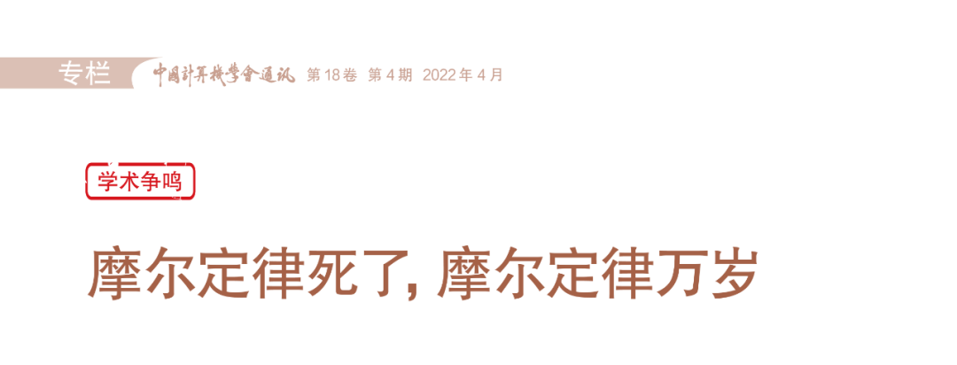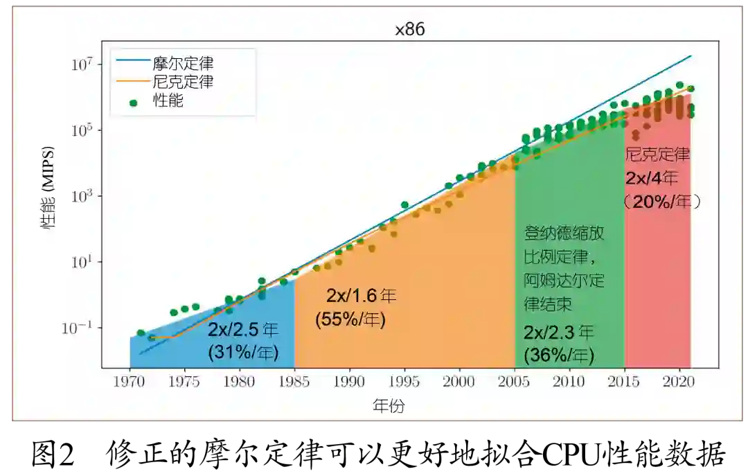 英特尔创始人之一戈登·摩尔(Gordon Moore)1965年预测集成电路密度翻倍所需的时间是一年[9],1975年他将这一速度修订为两年翻一倍[10],但现在我们已经观察到集成电路密度翻倍所需的时间超过3年。在2000年之前,每一代芯片的性能提升来自两个方面:按照Denard微缩定律(Denard Scaling):每代芯片的频率提升带来了40%的改进;而每代芯片晶体管密度提升带来的体系结构的改进符合波拉克法则(Pollack Rule),即平方根级别的提升,即41%。将这两方面的性能提升叠加可得1.4×1.41≈1.97,于是每代会有差不多一倍的提升[2]。据此,芯片晶体管密度的摩尔定律可换算成性能的摩尔定律。但Denard微缩定律已失效,单核性能的提升没法纯粹依靠主频的提升。于是,出现了多核处理器,以提升芯片吞吐量(throughput)性能,芯片的整体性能不只是单个核心的计算性能。总之,晶体管密度的增速在放缓,芯片主频的提升速度更慢,性能的改善越来越难。在2005年之前的20年里,微处理器的性能提升了1000倍,也就是每两年提升一倍;而之后的十多年很明显并没有达到这个速度[13]。