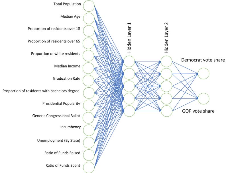 最终的神经网络模版,拥有14个输入节点,两组隐藏层,每组隐藏层有5个神经元,每个单一输出结点,给出预期的共和党和民主党的投票占有率。