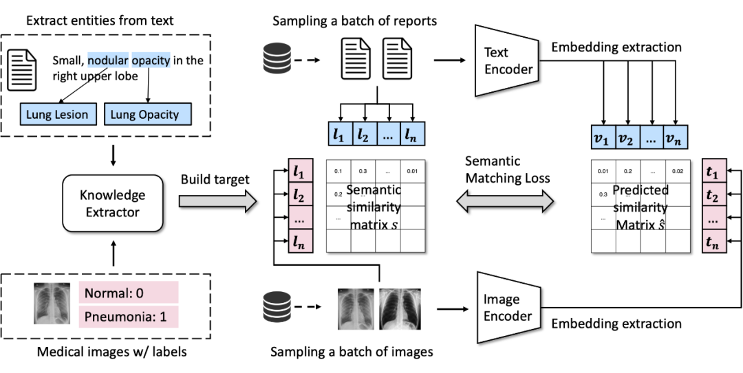 咱们这里主要关注最左边这一块。对于每条文本,我们都可以抽取它之中存在的一些关键实体,作为这条文本的弱标签。对于图片,我们有它们的标签,因为它们可能来源于已经标注好的纯图像数据集,或者有对应的报告,那么就用报告的标签作为它的标签。