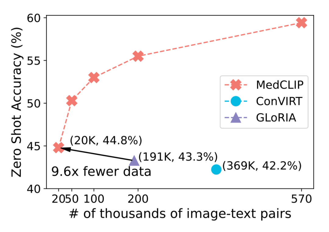 可以看到,相比 GLoRIA [4],我们的方法在只用 20K 数据的时候就已经达到了更强的零样本预测能力。随着样本量的增大,MedCLIP 的表现也在逐渐scale。可以期待如果更多的数据可用,它的表现还可以更好。值得注意的是,在我们的实验里,CheXpert+MIMIC-CXR 作为预训练数据集。但是,因为 MedCLIP 的特性,我们还可以考虑加入更多的图片数据进来。