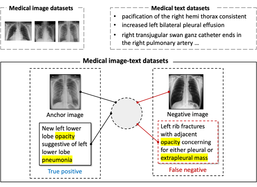 首先,跟 CLIP 相比,医疗领域的图像文本配对总量要小的多。CLIP 可以在 4 亿数据上充分训练,但是,X-ray 和配对的报告的公开数据集最大的也只有数十万这个级别,分别是 CheXpert(20万)和 MIMIC-CXR(37万)。这就严重限制了模型的能力。同时,我们其实还有大量的纯医疗图像或者纯文本数据。由于使用 CLIP 的对比学习方法,模型只能利用天生配对的图片+报告来训练。这就导致了医疗图文训练的天生在数据量方面的跛腿,从而很难达到 CLIP 那样的高度。