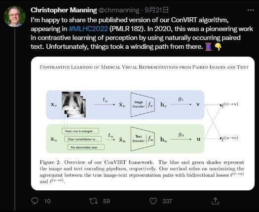 医疗相关也有可用的图像和文本的配对数据集。最知名的应该是一些列胸片和临床报告的配对数据,比如 CheXpert, MIMIC-CXR 等。早在 CLIP 之前,ConVIRT [2] 就已经展示了 InfoNCE 式对比学习在医疗图文数据上的能力。但是不幸的是,由于数据不够大,表现不够 excited,这篇文章没有搞出一个大新闻,最终才在今年的 MLHC 会议上发表。当时还让作为作者之一的 Christopher Manning 大佬发推吐槽了一番。