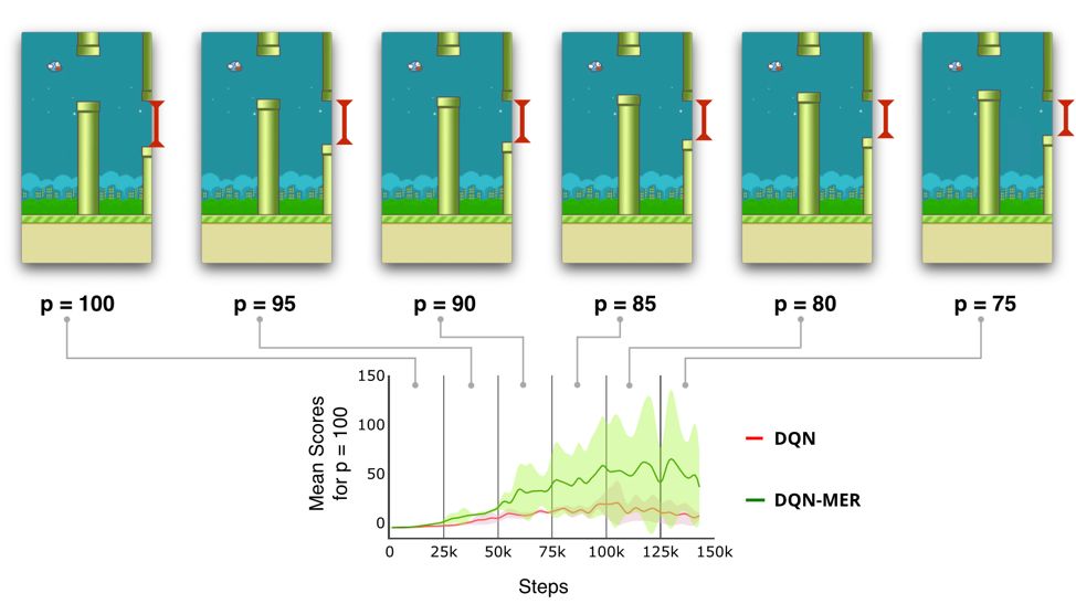We considered the evaluation of MER in a continual reinforcement learning setting where the environment is highly non-stationary. Specifically, we used Catcher and Flappy Bird. In the case of Flappy Brid, MER was trained to navigate through pipes while making the pipe gap the bird needs to get through smaller and smaller gaps as the game progresses. This environment results particularly challenging to achieve continual reinforcement learning give the sudden changes to the dynamics of gameplay that really tests the agent’s ability to detect changes in the environment without supervision.