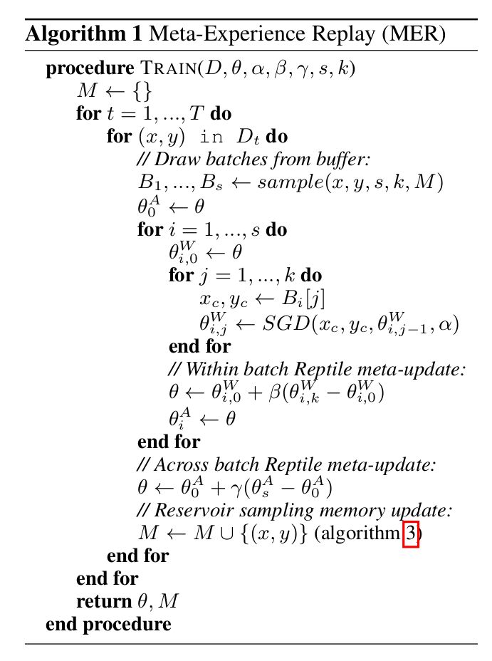 MER maintains an experience replay style memory M with reservoir sampling and at each time step draws s batches including k − 1 random samples from the buffer to be trained alongside the current example. Each of the k examples within each batch is treated as its own Reptile batch of size 1 with an inner loop Reptile meta-update after that batch is processed. We then apply the Reptile meta-update again in an outer loop across the s batches.