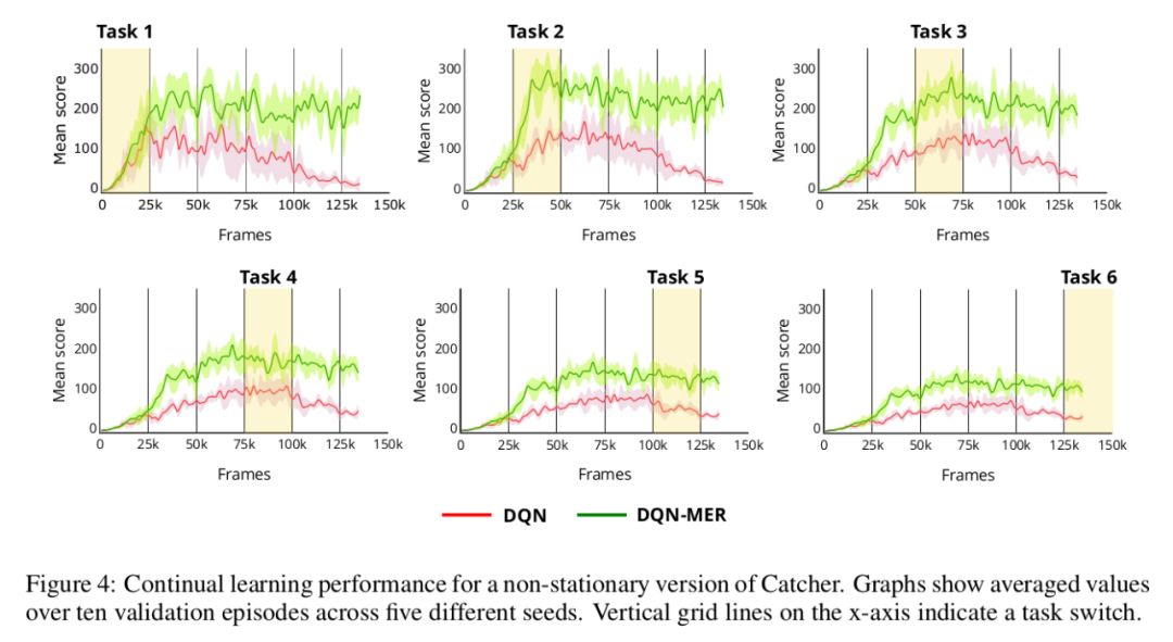 In Catcher, we then obtain different tasks by incrementally increasing the pellet velocity a total of 5 times during training. In the experiments MER outperform standard DQN models as shown in the following figure: