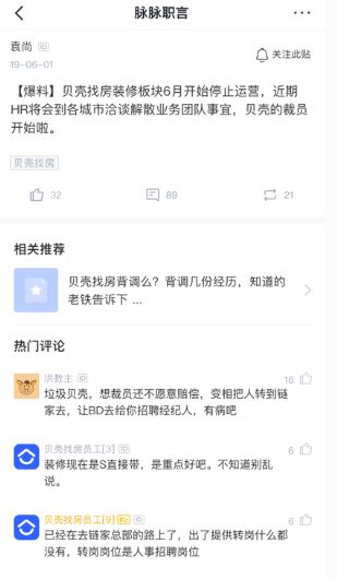 6月1日,脉脉网友在平台发言表示,贝壳找房装修板块6月开始停止运营,近期HR将会到各城市洽谈解散业务团队事宜。