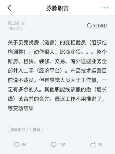 今年2月,脉脉网友在平台发消息称,“关于贝壳找房(链家)的变相裁员(组织结构调整)。动作很大,比滴滴狠...整个新房、租赁、装修、交易、海外这些业务全部并入二手(经济平台)。产品技术运营目前说不裁员,但是感觉人员大于工作量,一定有多余的人。其他职能线该撤的撤,(增长线)该合并的合并。最近工作不用推进了,等变动结果”。