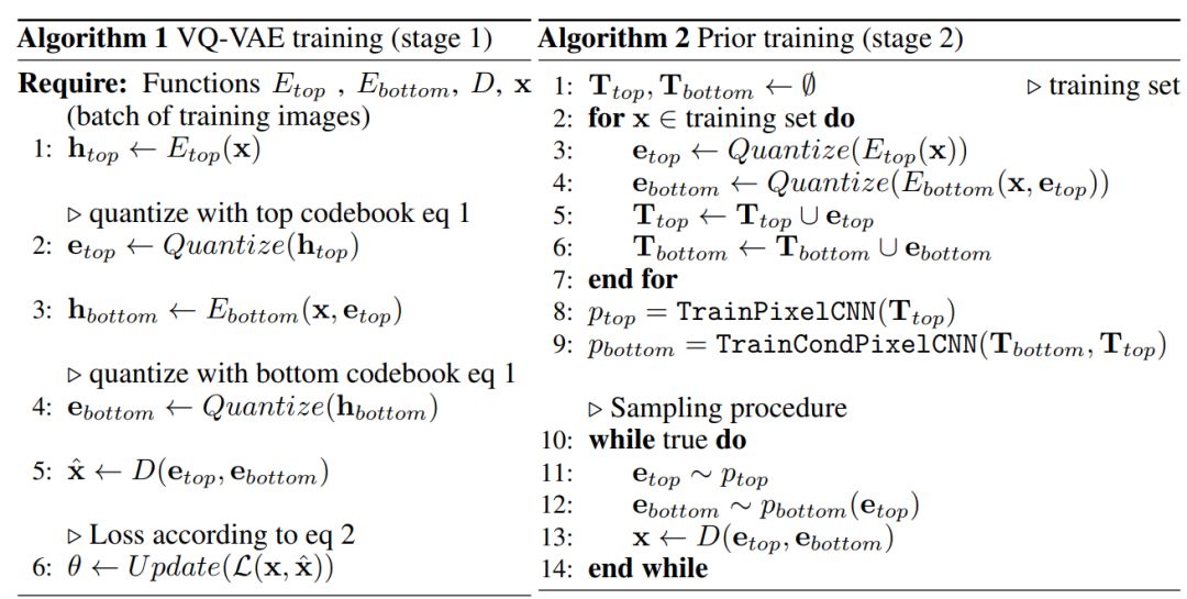 具体而言,提出的方法遵循两阶段过程:首先我们需要训练一个分层的 VQ-VAE,我们需要用它将图像编码到离散的隐空间;其次我们需要在离散的隐空间拟合一个强大的 PixelCNN 先验,这个隐空间是通过所有图像数据构建的。