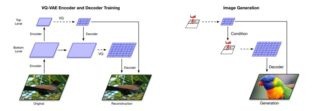 下图展示了该模型的训练和生成过程,它们的过程基本和自编码器类似。如下左图所示为分层 VQ-VAE 的整体架构,它是由编码器和解码器组成的深度神经网络。模型输入是一张 256×256 的图像,它会分别压缩为 64×64 的底层量化隐层和 32×32 的高层量化隐层。解码器从两个隐层中重建图像。