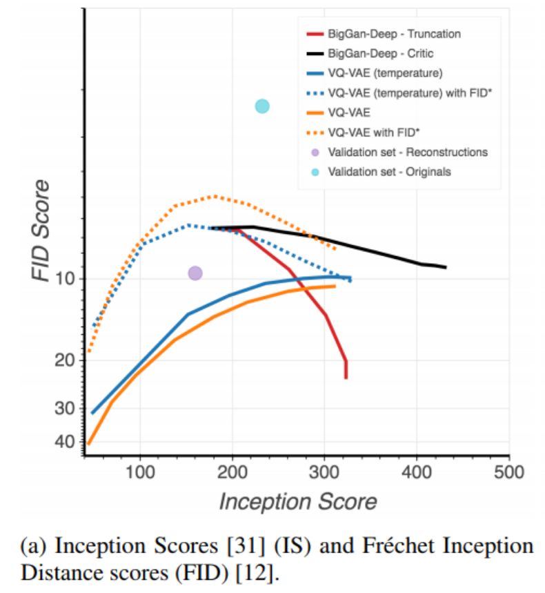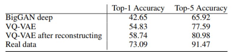 表 2:真实数据集、BigGAN-deep 和 VQ-VAE 模型的分类准确率分数(CAS)