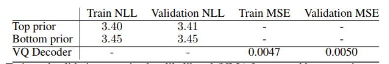 表 1 为文中模型 top 先验和 bottom 先验的 NLL 值,在训练和验证方面都很接近,表示两个网络都没有过拟合。